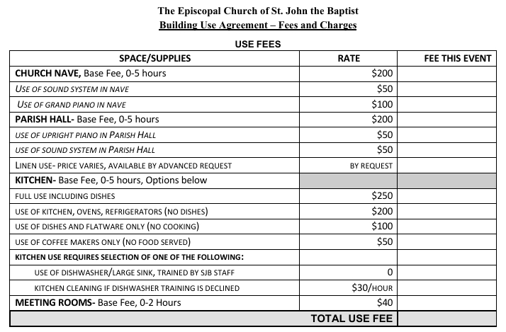 Our standard building rental rates may be found in the table below. At this time our space is available to non-profit organizations and other community groups. Please contact the Church Office for more information about building use rentals.